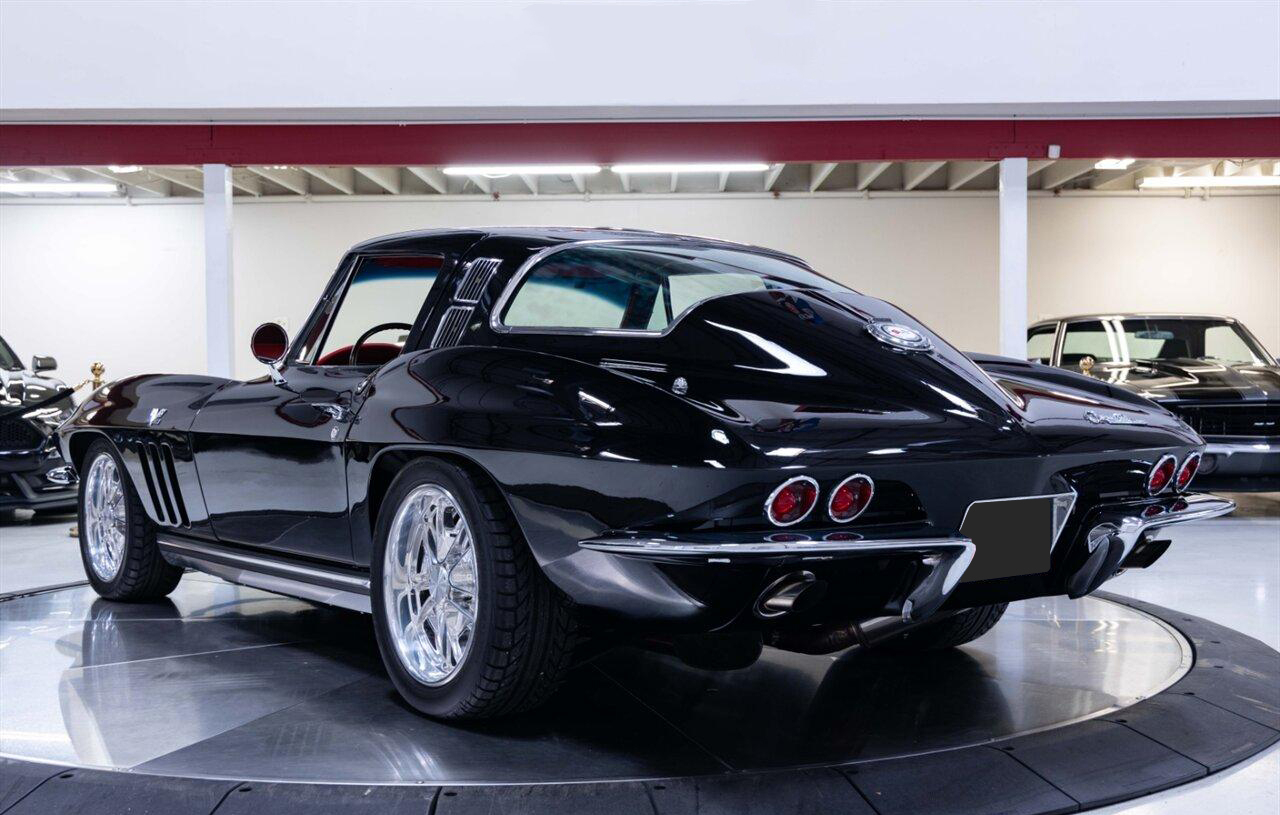 1965 Chevrolet Corvette Coupe in Raven Black over Red Interior. Equipped with a Fuel Injected 496ci Big Block Engine mated to a Tremec 5 Speed Manual Transmission. This incredible Pro Touring Corvette is a complete frame-off restoration. Features include: Holley Sniper Fuel Injection, Air Conditioning, Rack n Pinion Power Steering, 4 Wheel Wilwood Disc Brakes, Coilover Suspension, Ron Davis Aluminum Radiator, Sanderson Headers w/ Custom 3" Stainless Exhaust, MSD Ignition, Rockford Fosgate Components and Subwoofer, Custom 17" Wheels and more! This stunning Corvette is ready to be shown or driven.