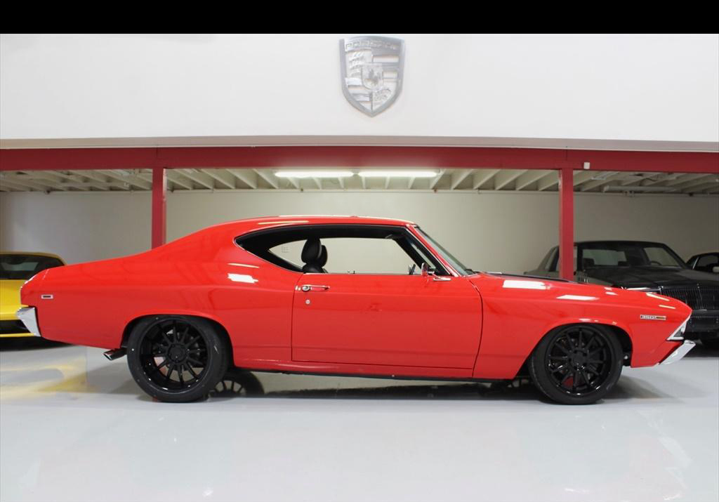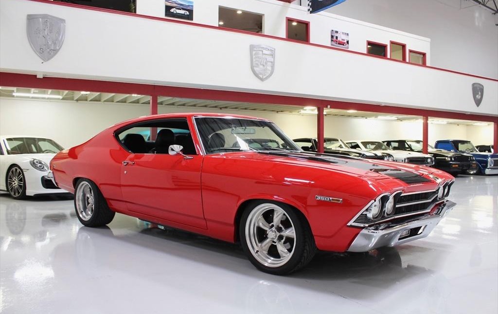 1969 Chevrolet Chevelle in Red over Black Custom Interior. Equipped with a 350ci Engine mated to a TH350 Automatic Transmission. This beautiful Chevelle is a fresh restoration that was just completed in early 2018, with less than 100 miles on the car since. Freshly built 350 with Comp Cam and Aluminum heads. Custom interior featuring red-stitched upholstery with suede inserts on the seats and door panels, Autometer aluminum instrument gauges, B&M shifter, and a stereo system with Sony CD player and Phoenix Gold speakers. Vintage Air A/C system. Power steering. Power disc brakes front & rear. Custom headers and exhaust. Quick Fuel carburetor. Aluminum radiator with electric fans. The buyer has the choice to go with the polished 17" American Racing wheels or Dub.1One 3-piece wheels. Either set will come with brand new tires on them.