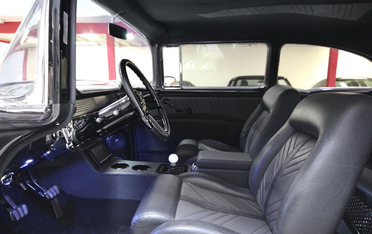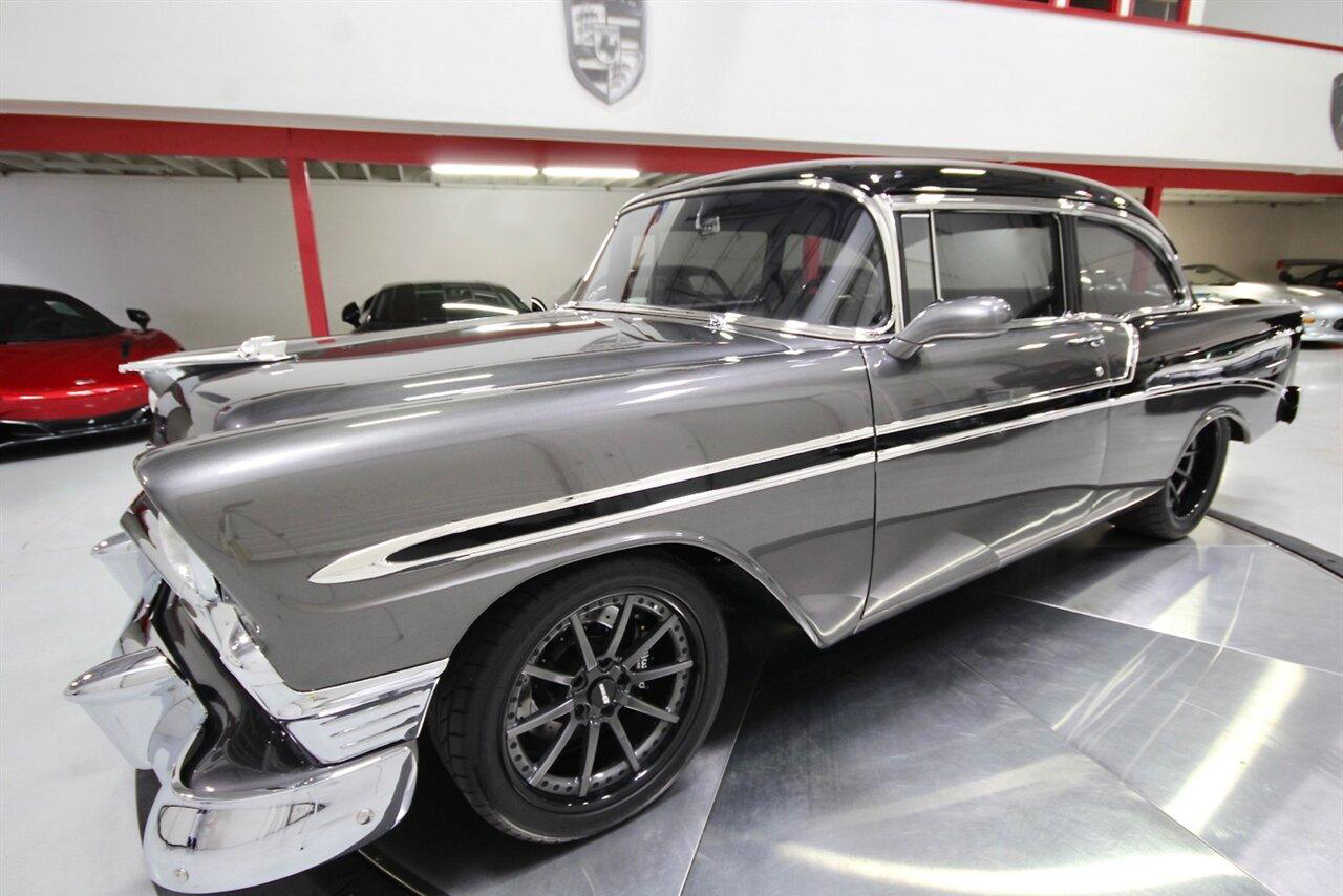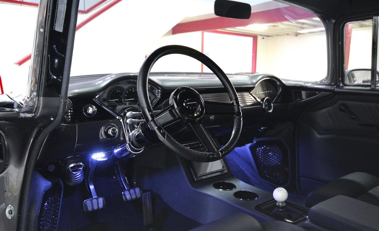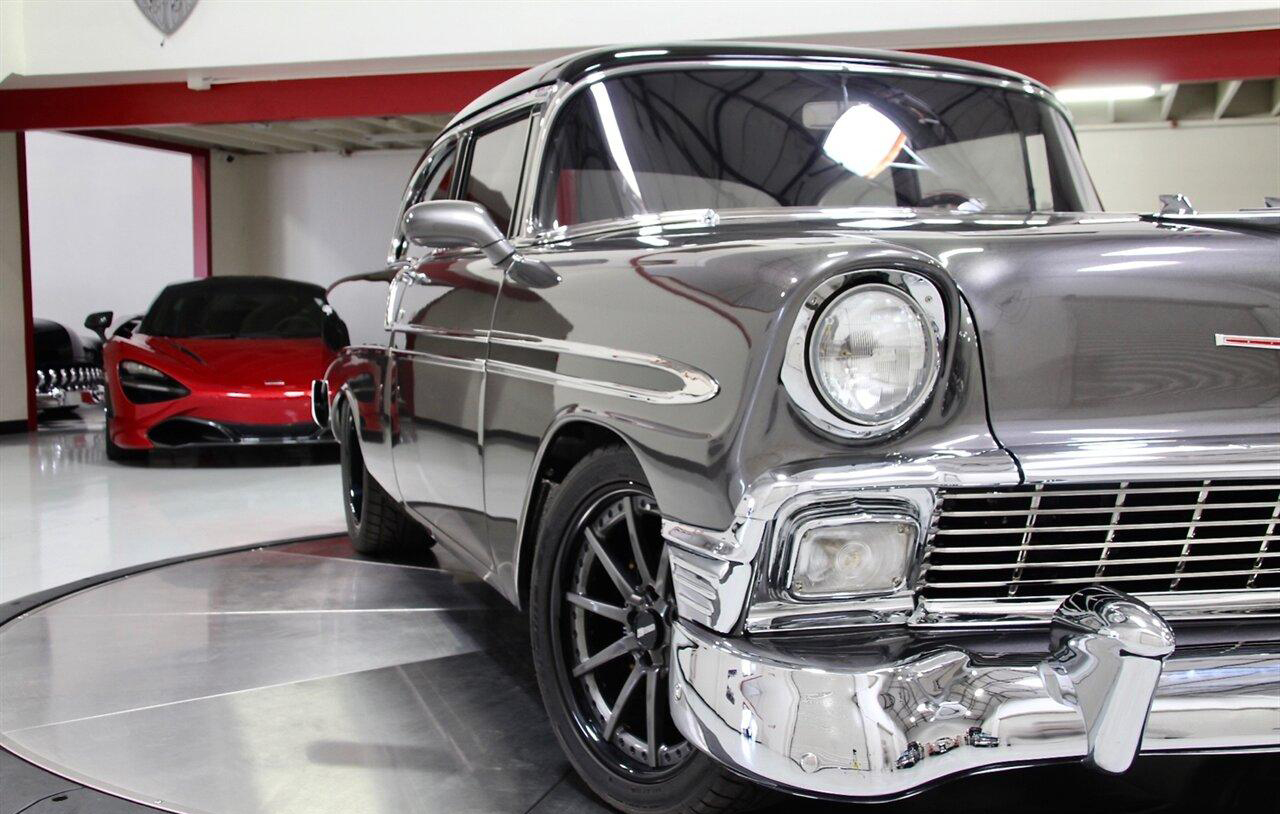 1956 Chevrolet Bel Air in Black and Gunmetal Metallic over Gray Custom Leather Interior. Equipped with a Supercharged LS3 V8 Engine mated to a Tremec T56 6-Speed Manual Transmission. This incredible Tri-Five has undergone a complete nut & bolt restoration and modernized to perform as great as it looks. Very little miles on the car since the build was completed, and it remains in show quality condition all around. The LS3 engine has been fitted with an Eaton supercharger from a Cadillac CTS-V and also features a Cam Motion camshaft, Dual valve springs, Titanium retainers and hardened push-rods, and a Professional street tune. Power steering. Power windows. Wilwood 6-piston disc brakes. Electronic parking brake. Vintage Air A/C. Dakota Digital instrument gauges. Back-up camera. Custom leather upholstered seats, headliner, and center console. Incredible professional sound system with Sony touch-screen head unit. Viper alarm system. CPP tubular control arms. Viking billet adjustable shocks. Caltracs traction bars. B-Forged custom built wheels. Ford 9" rear end with 3.55 gears. Smoked glass. Beautiful brightwork. The car has beautiful body and paint, incredible fit and finish throughout, and it runs and drives incredible.