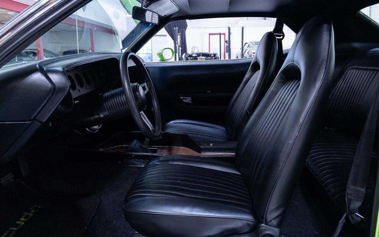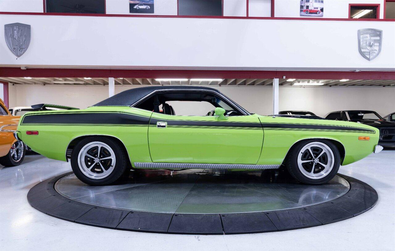 1974 Plymouth Cuda in Sublime Green over Black Leather Bucket Seat Interior. Equipped with a 360ci V8 mated to a 4 Speed Manual Transmission. This Cuda 360 is an excellent example of a rare Mopar. Just 398 Cuda 360's were produced with a manual transmission in 1974. Features Include: Edelbrock Fuel Injection, Power Disc Brakes, Power Steering, Hurst Pistol Grip Shifter, 3.55 Gears, Vinyl Top, Custom 17" Wheels, 3 Speed Variable Wipers, AM/FM Radio, Floor Mounted Fire Extinguisher and more! This very solid Cuda is ready to be driven and enjoyed!