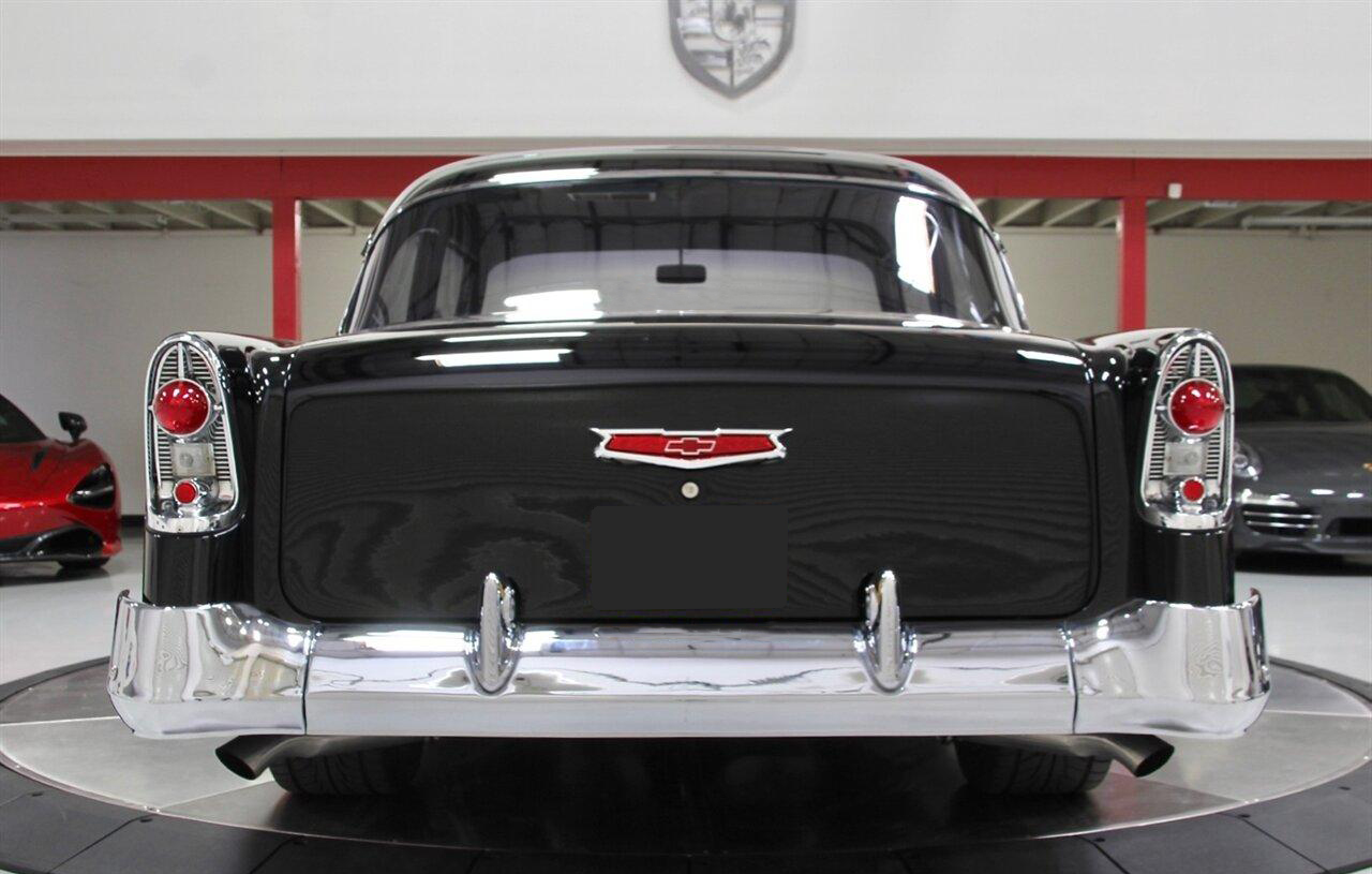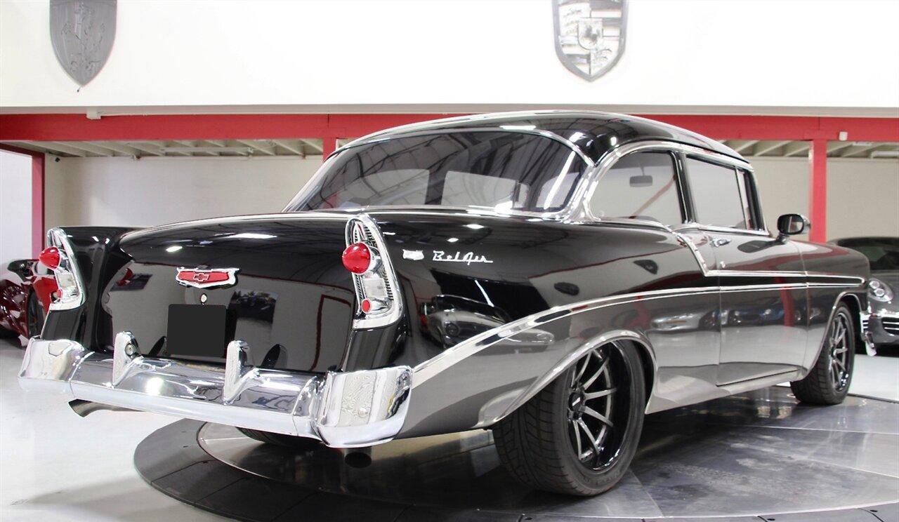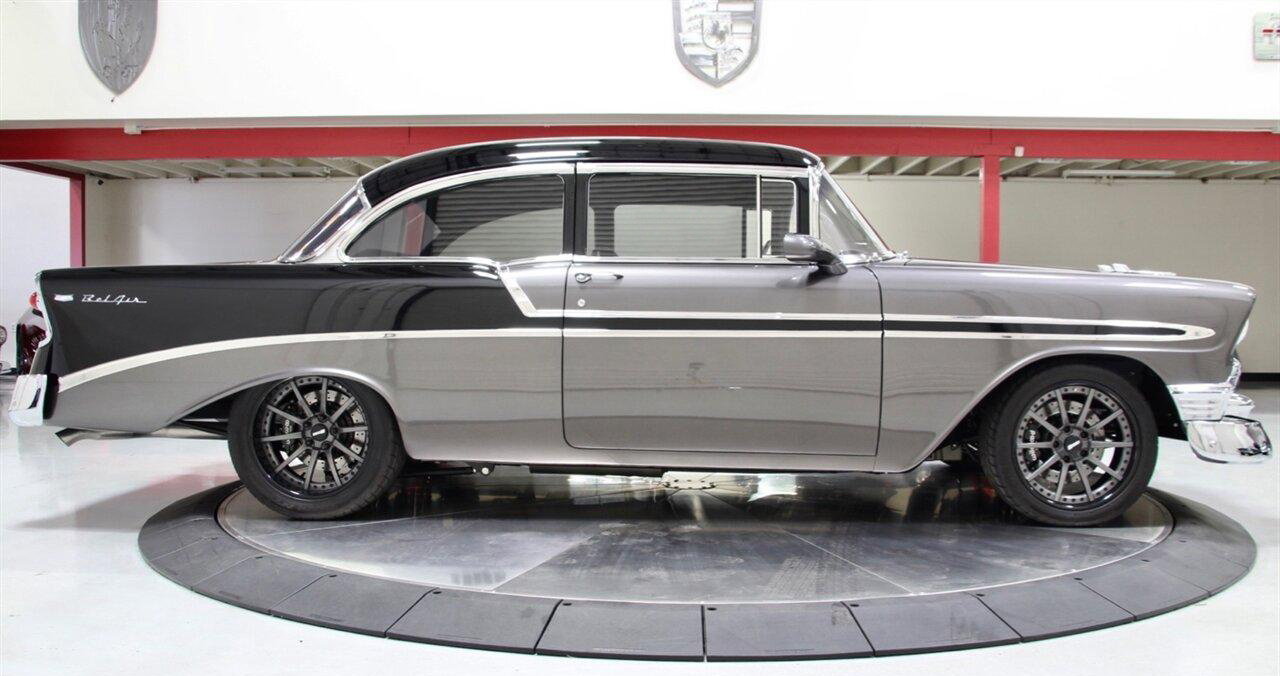 1956 Chevrolet Bel Air in Black and Gunmetal Metallic over Gray Custom Leather Interior. Equipped with a Supercharged LS3 V8 Engine mated to a Tremec T56 6-Speed Manual Transmission. This incredible Tri-Five has undergone a complete nut & bolt restoration and modernized to perform as great as it looks. Very little miles on the car since the build was completed, and it remains in show quality condition all around. The LS3 engine has been fitted with an Eaton supercharger from a Cadillac CTS-V and also features a Cam Motion camshaft, Dual valve springs, Titanium retainers and hardened push-rods, and a Professional street tune. Power steering. Power windows. Wilwood 6-piston disc brakes. Electronic parking brake. Vintage Air A/C. Dakota Digital instrument gauges. Back-up camera. Custom leather upholstered seats, headliner, and center console. Incredible professional sound system with Sony touch-screen head unit. Viper alarm system. CPP tubular control arms. Viking billet adjustable shocks. Caltracs traction bars. B-Forged custom built wheels. Ford 9" rear end with 3.55 gears. Smoked glass. Beautiful brightwork. The car has beautiful body and paint, incredible fit and finish throughout, and it runs and drives incredible.