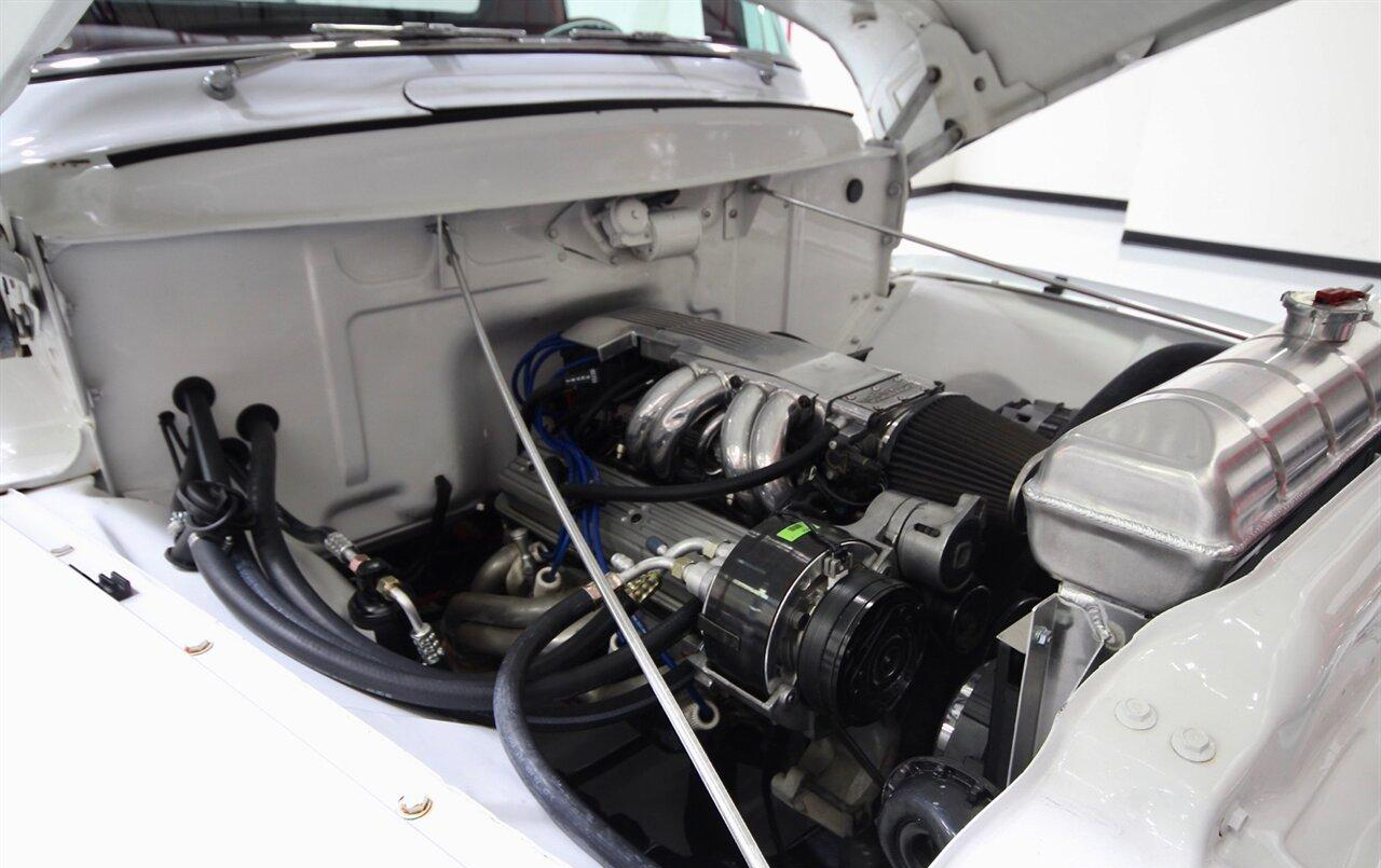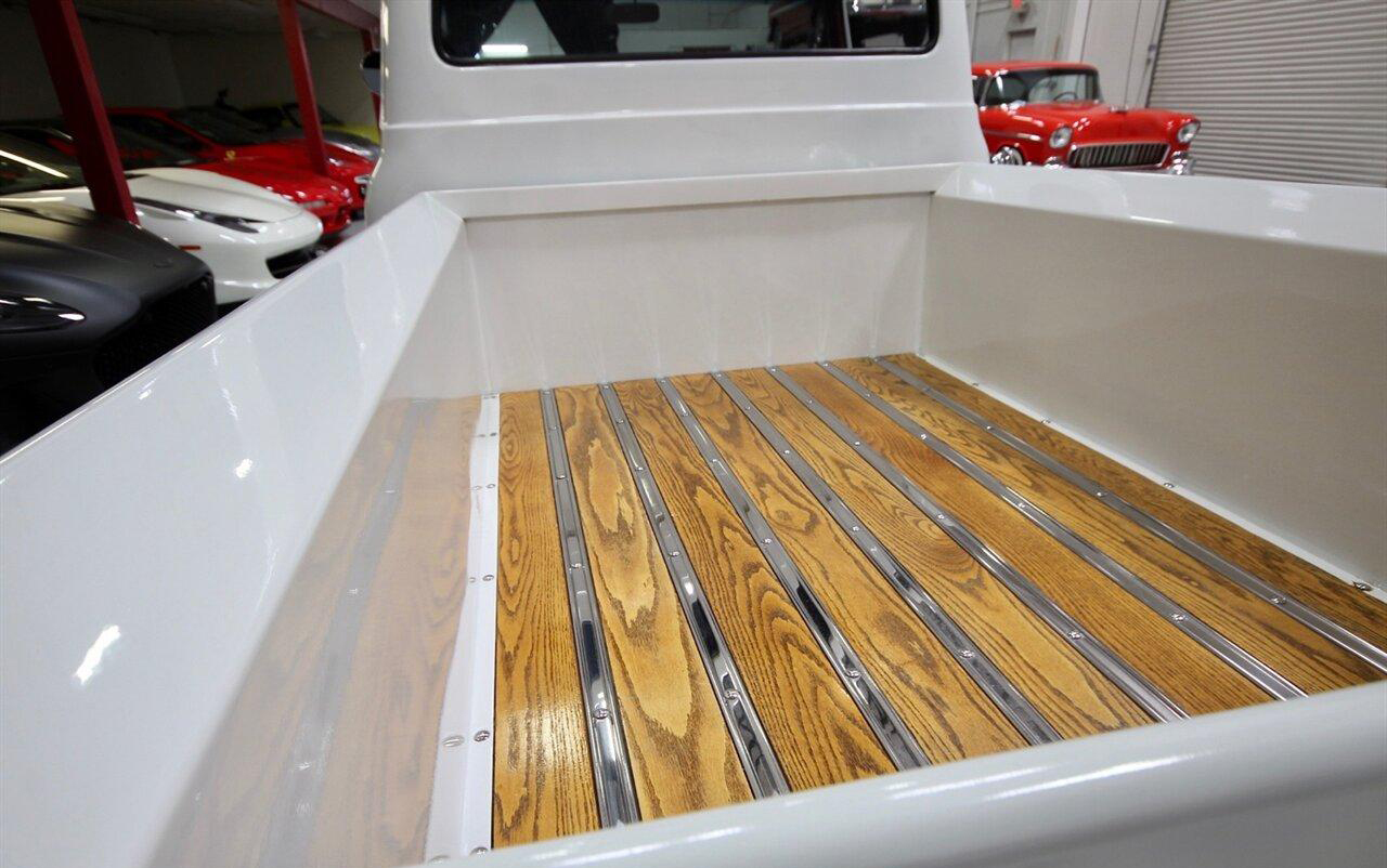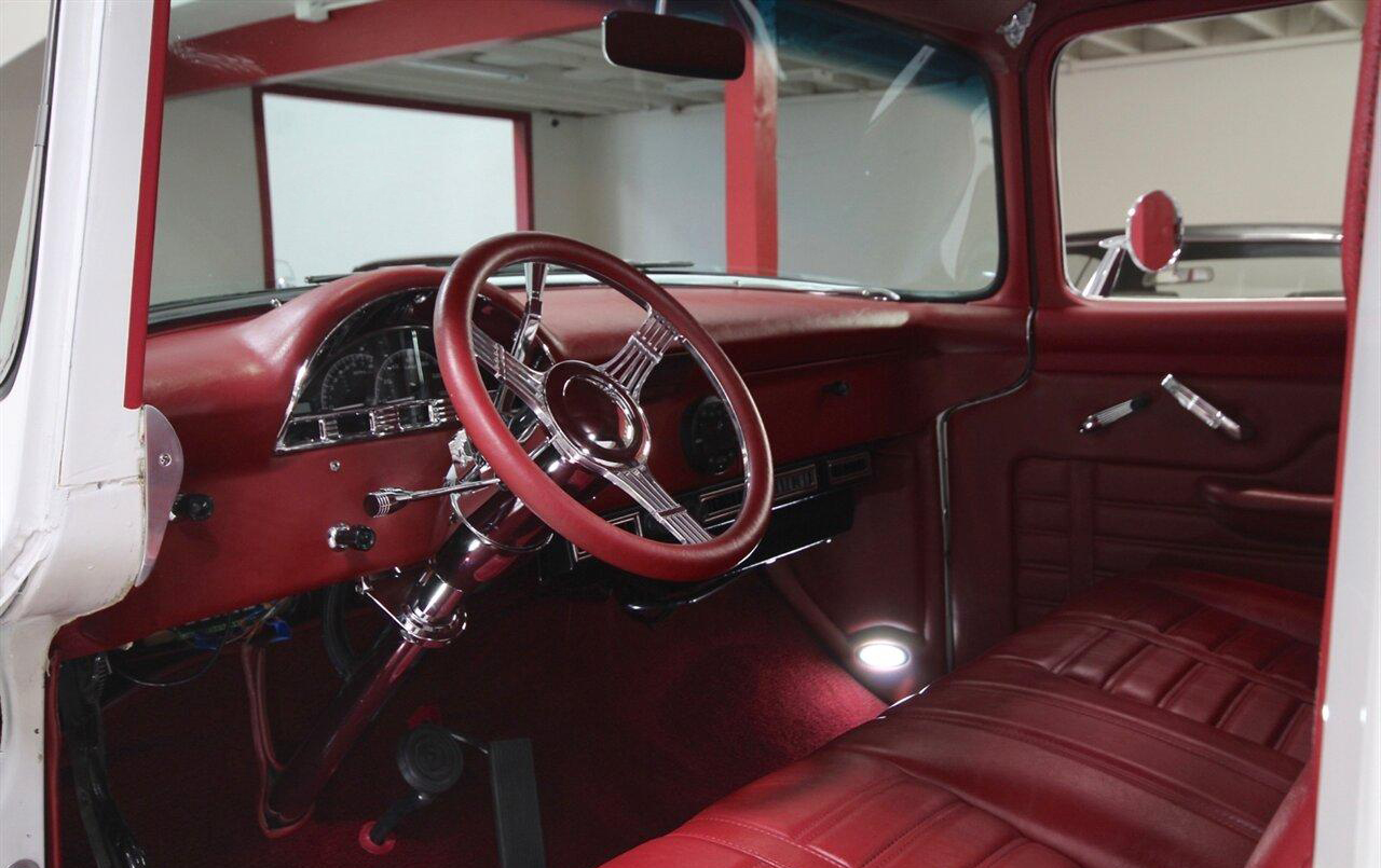 1956 Ford F-100 in White over Red Leather Interior. Equipped with a 350ci Tune Port Injected V8 Engine mated to a 700R4 Automatic Transmission. This beautiful restomod pickup has been updated with Power Steering, Power Disc brakes front and rear, Vintage Air A/C, Lanzar AM/FM radio with Bluetooth, VHX instrument cluster, Tilt steering column, Custom interior with beautiful dark red upholstery, 20" Ridler wheels, Jaguar rear end with IRS, Roll pan, Wooden bed, Headers with custom exhaust, Louvered hood, and more! The truck runs and drives great and turns heads everywhere it goes.