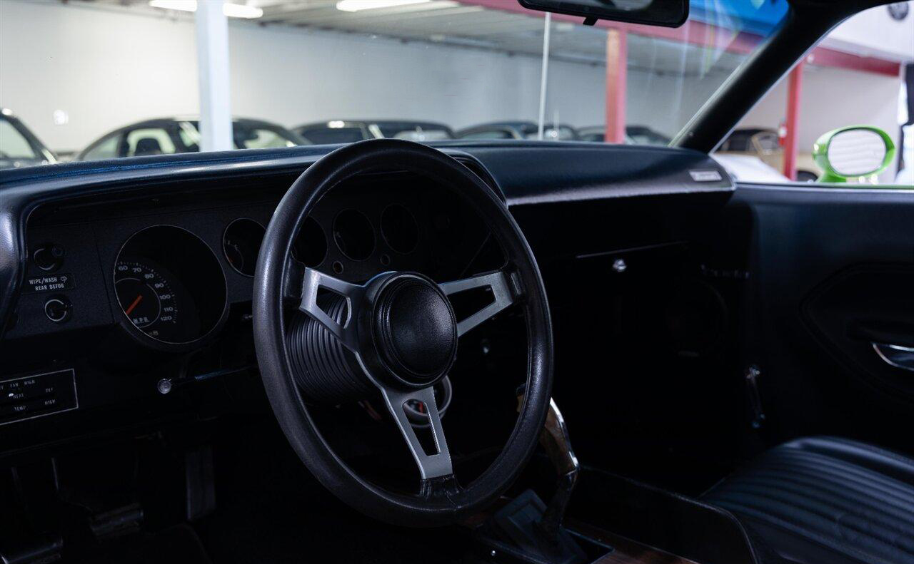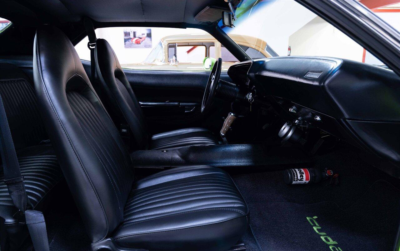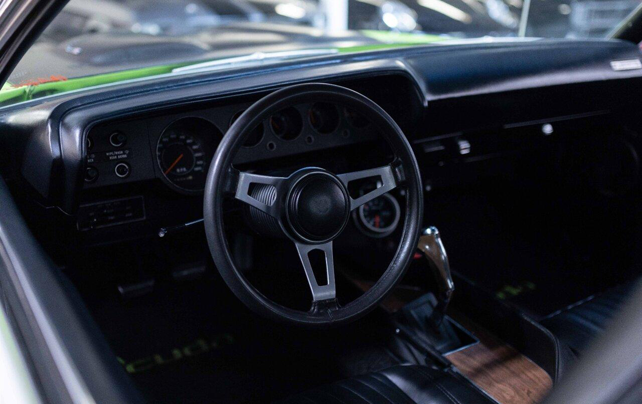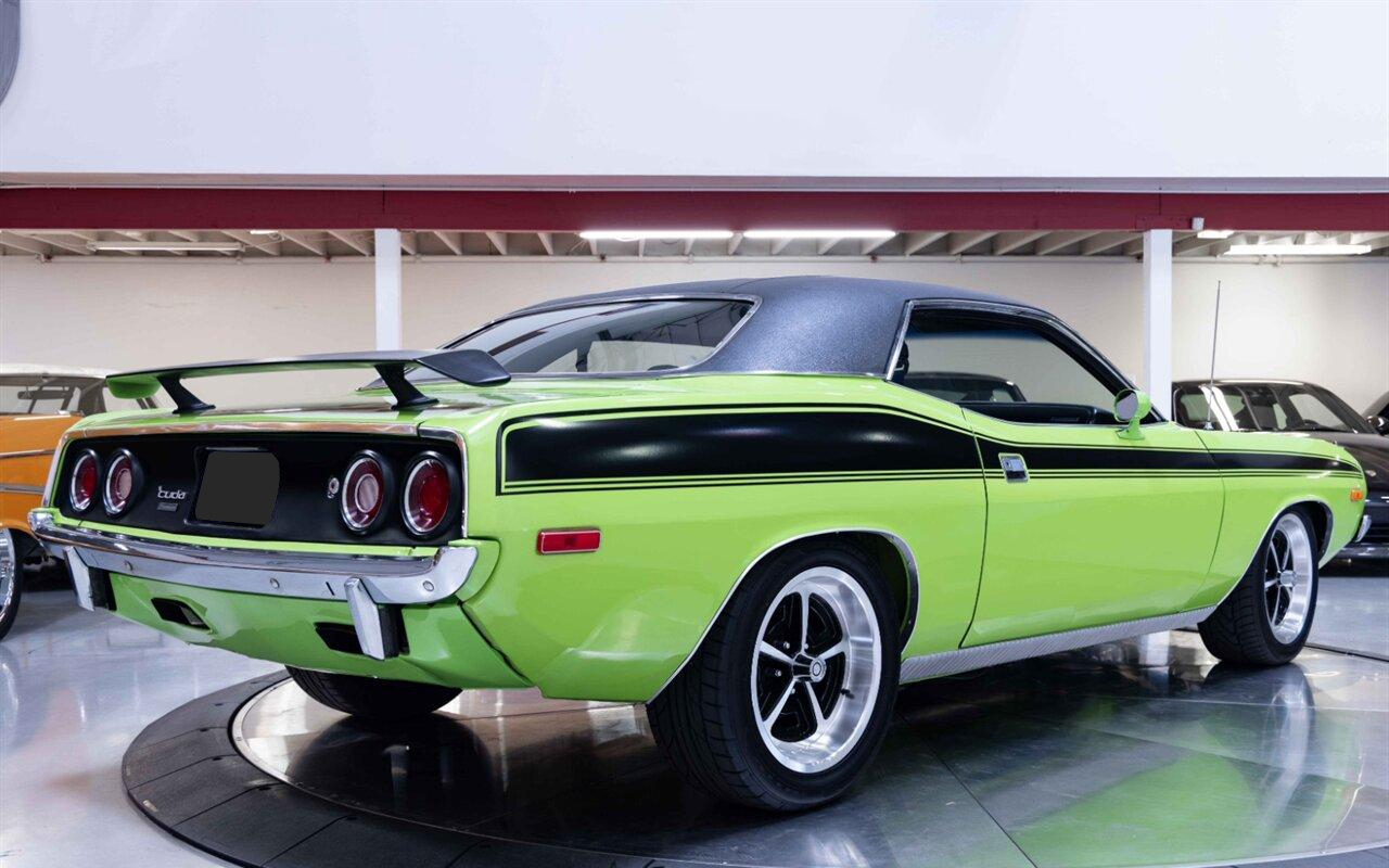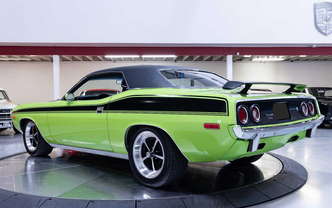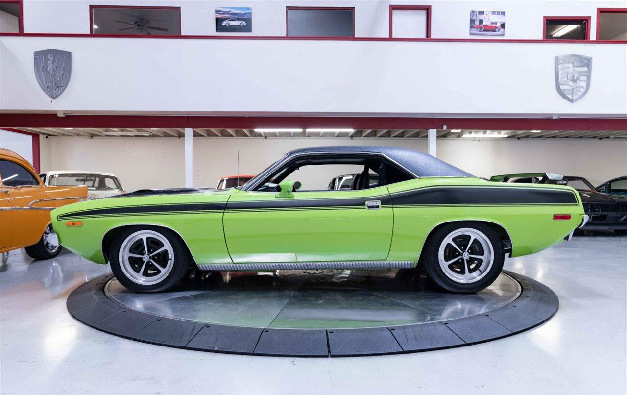 1974 Plymouth Cuda in Sublime Green over Black Leather Bucket Seat Interior. Equipped with a 360ci V8 mated to a 4 Speed Manual Transmission. This Cuda 360 is an excellent example of a rare Mopar. Just 398 Cuda 360's were produced with a manual transmission in 1974. Features Include: Edelbrock Fuel Injection, Power Disc Brakes, Power Steering, Hurst Pistol Grip Shifter, 3.55 Gears, Vinyl Top, Custom 17" Wheels, 3 Speed Variable Wipers, AM/FM Radio, Floor Mounted Fire Extinguisher and more! This very solid Cuda is ready to be driven and enjoyed!